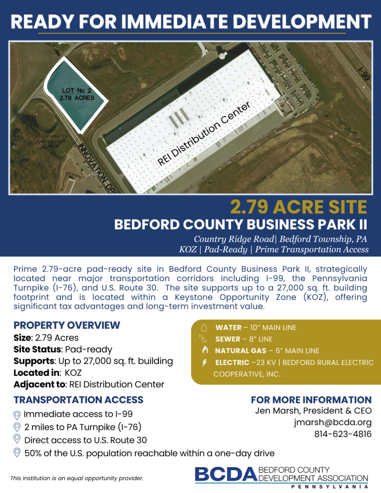 Bedford County Business Parks provide high-quality, turn-key sites for a variety of clients, including DAR Professional Building, Rex Heat Treat Bedford Inc., MDL Manufacturing Industries, Inc., XPO Logistics (Con-Way Trucking), Bedford Reinforced Plastics, Inc., CaptiveAire, Inc. Commercial Kitchen Ventilation, The Organics Snack Company and the Bedford County Development Association.
